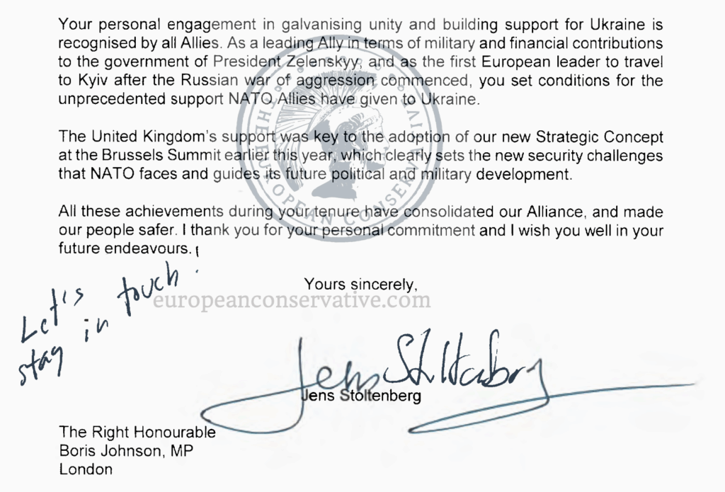 Even after leaving Downing Street, NATO explicitly acknowledged Johnson’s role in this strategic shift. In a personal letter dated September 9, 2022, seen by this publication, former Secretary-General Jens Stoltenberg thanked Johnson for his “leadership in galvanising unity and building support for Ukraine,” noting that his visit to Kyiv had “set conditions for the unprecedented support NATO Allies have given to Ukraine.”