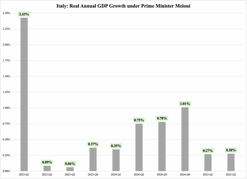 - Over the ten quarters from 2023 through the second quarter of 2025, the Italian economy expanded at 0.64% per year, on average, adjusted for inflation;