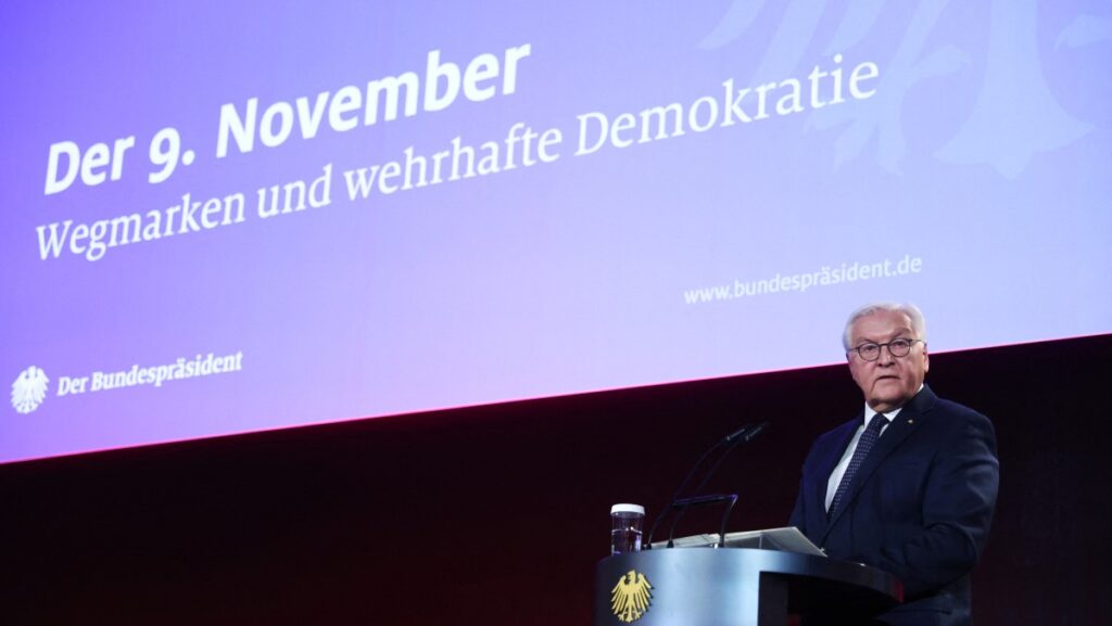 German President Frank-Walter Steinmeier gives a speech on current dangers to democracy, on the anniversary of the fall of the Berlin Wall in 1989, the Nazi’s anti-Jewish pogrom of 1938 and the proclamation of the post-World War I republic in 1918, at the German President’s Bellevue Palace in Berlin, Germany, on November 9, 2025.