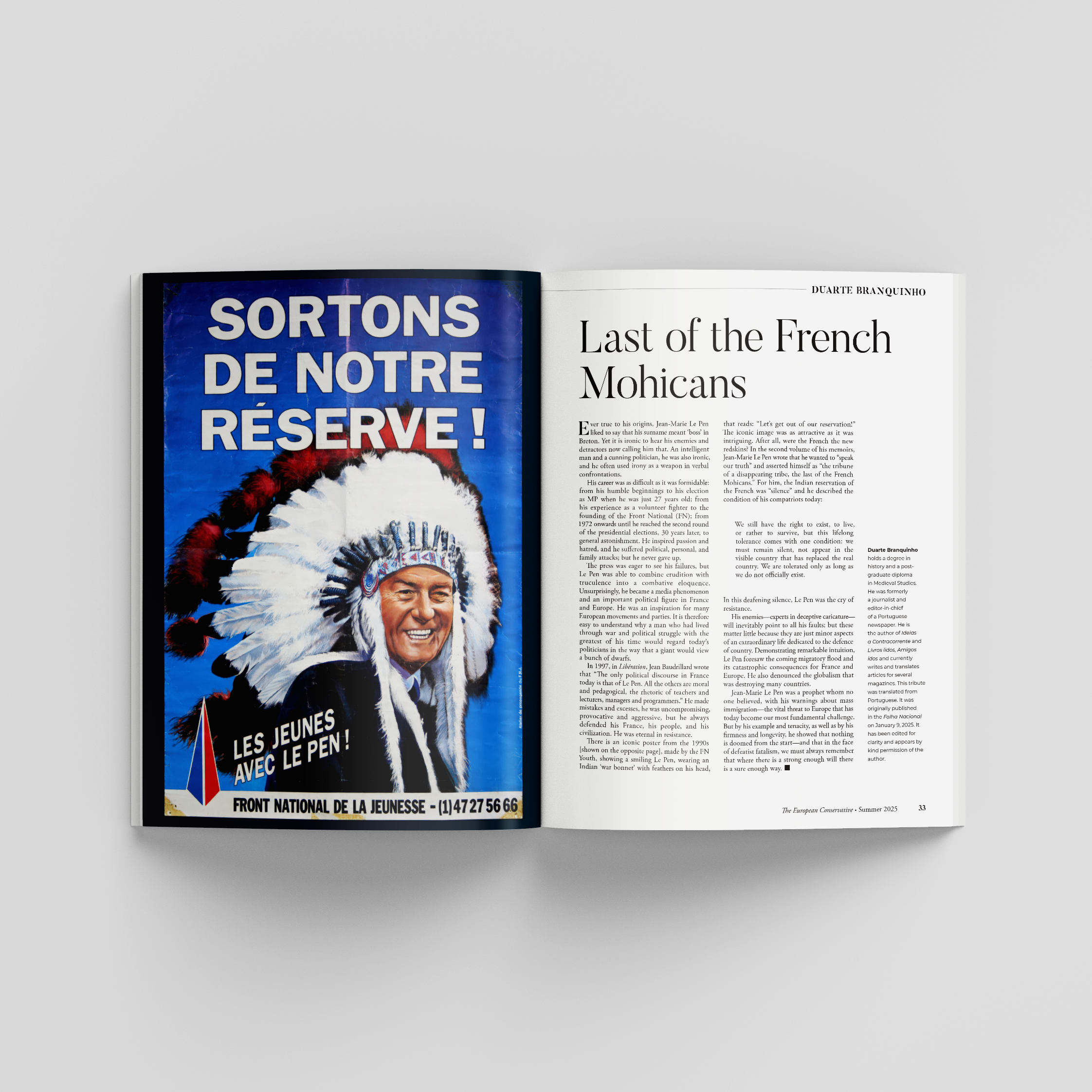 In this section: “Last of the French Mohicans” by Portuguese historian and journalist Duarte Branquinho; remarks by Le Pen’s niece, Marion Maréchal, during his Requiem Mass; Polish Le Pen expert Kacper Kita’s “A Voice in the Wilderness”; Spanish professor Domingo González on Le Pen’s “Divided Legacy”; French publisher Guillaume de Thieulloy’s account of publishing Le Pen’s memoirs: “je ne regrette rien”; “An Italian Retrospective” by journalist Max Ferrari; and Hélène de Lauzun takes a nuanced look at Le Pen’s political life in “The Cost of Audacity.”